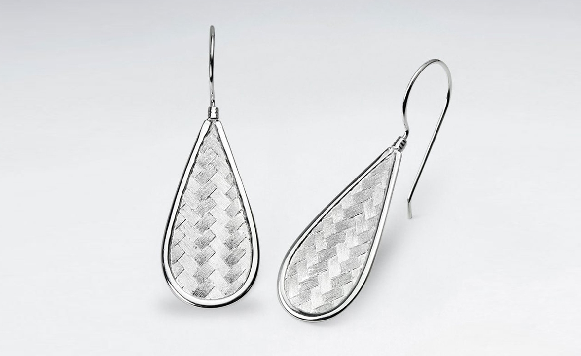Posee forma de lagrima como también textura de canasta en el centro, ya que esta conformado por tiras de plata entrelazadas.